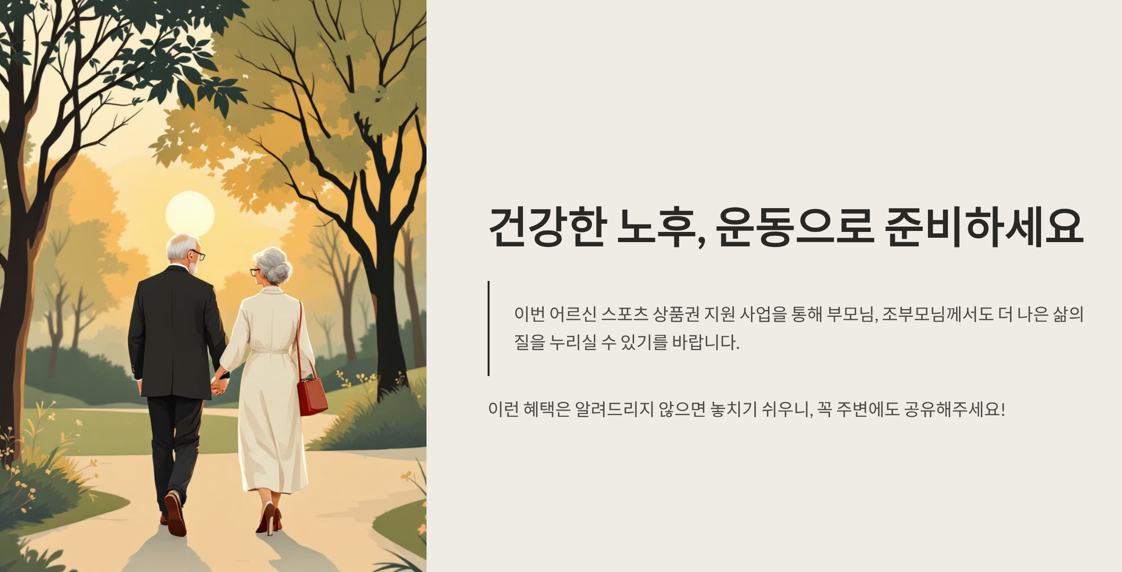 운동은 단순한 건강관리를 넘어 정신적 활력과 사회적 교류까지 책임지는 중요한 활동이에요. 이번 어르신 스포츠 상품권 지원 사업을 통해 부모님, 조부모님께서도 더 나은 삶의 질을 누리실 수 있기를 바랍니다. 이런 혜택은 알려드리지 않으면 놓치기 쉬우니, 꼭 주변에도 공유해주세요!