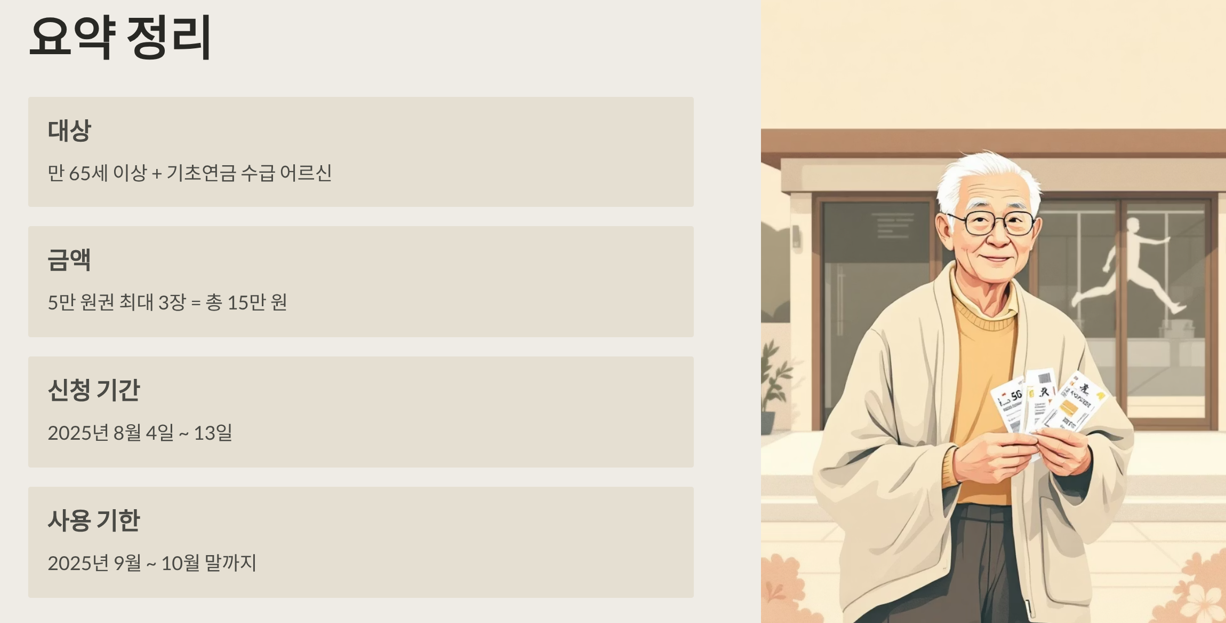 - 2025년 2차 추가경정예산으로 총 70만 장, 예산은 365억 원(국비 260억 + 지방비 105억)입니다.