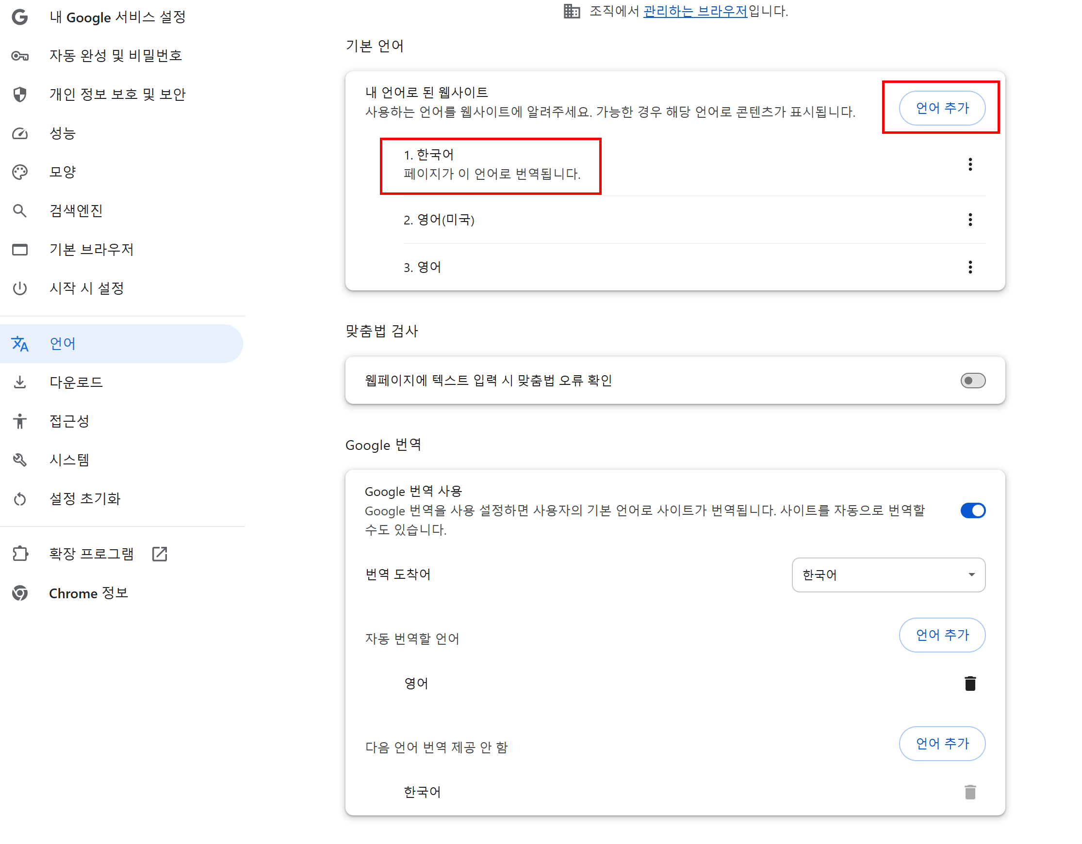 이 메뉴에서는 크롬 사용자 인터페이스의 표시 언어와 웹사이트가 콘텐츠를 표시하는 언어를 제어할 수 있습니다. 크롬은 다양한 언어를 지원하므로 다국어 사용자도 쉽게 전환할 수 있습니다.