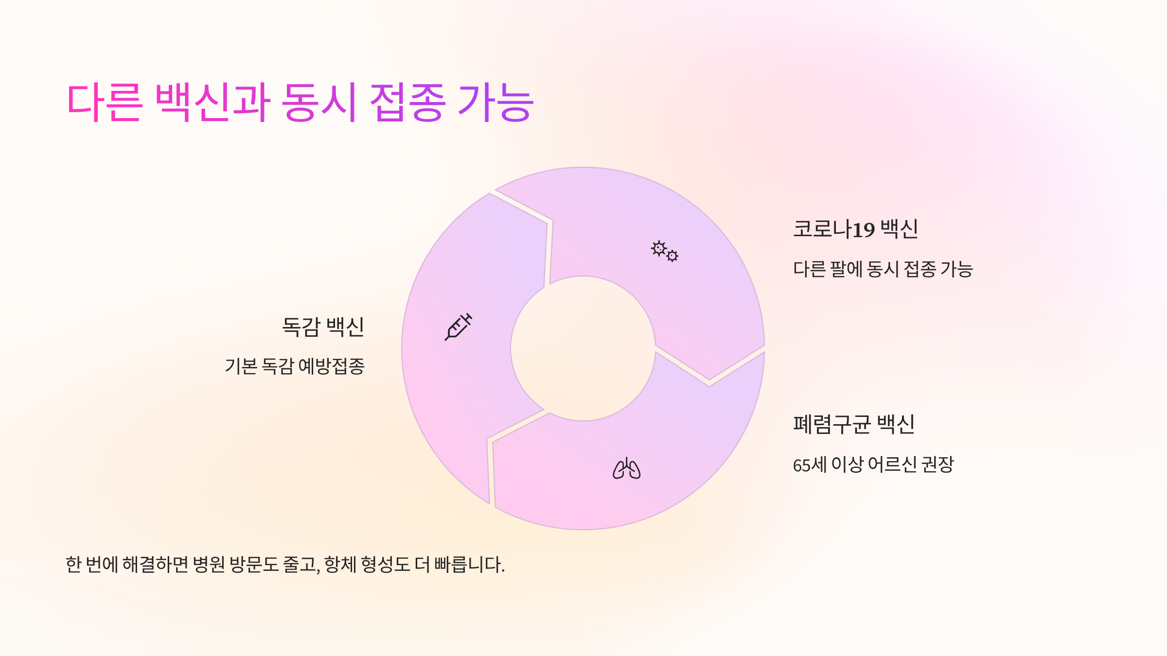 특히 65세 이상 어르신이라면 코로나19 백신, 폐렴구균 백신과 함께 맞는 걸 권장해요.