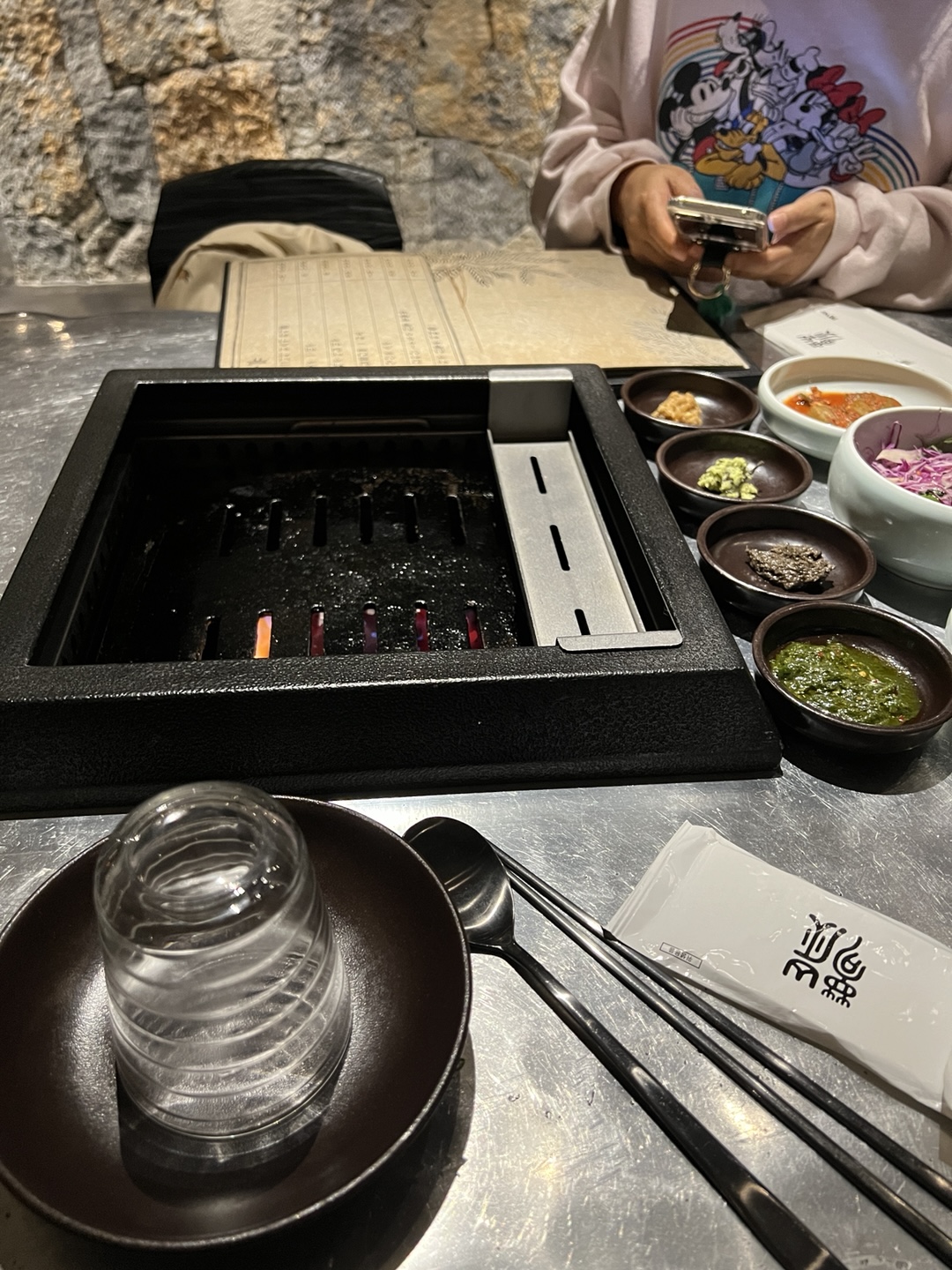 기본 반찬은 깔끔하게 세팅되며, 와사비·쌈장·특제 소스를 곁들여 다양한 맛을 즐길 수 있습니다. 양파·버섯 등 구운 채소와 함께 먹으면 느끼함 없이 담백하게 즐길 수 있습니다.