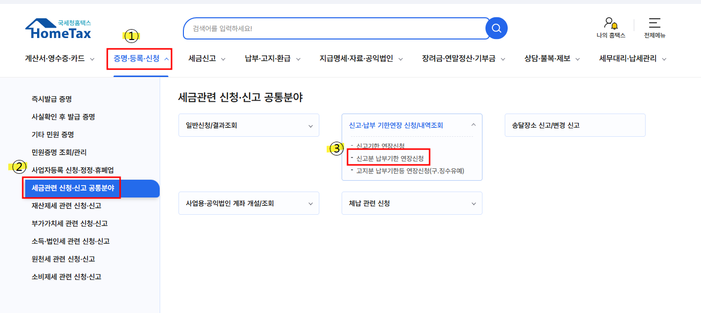 증명.등록, 신청 -> 세금관련 신청, 신고 공통분야-> 신고분 납부기한 연장 신청 클릭