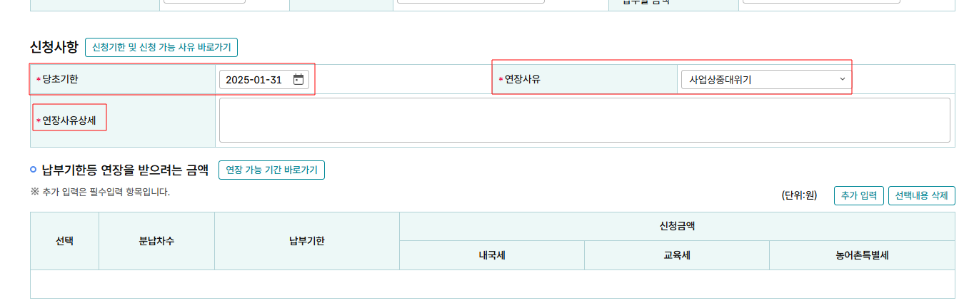 (정기신고부분 연장신청시 -신고분 / 고지된 금액 연장신청시-고지분 클릭)