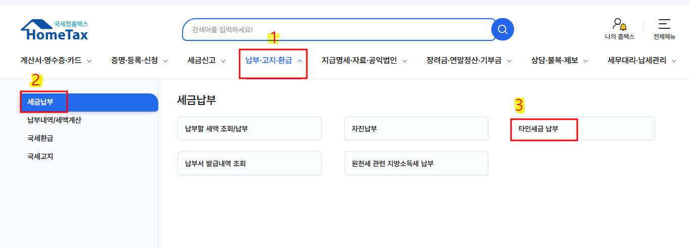 홈택스 메인화면 납부고지환급 -> 세금납부-> 타인세금 납부