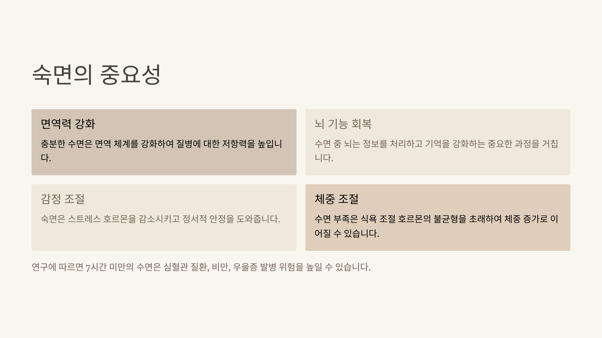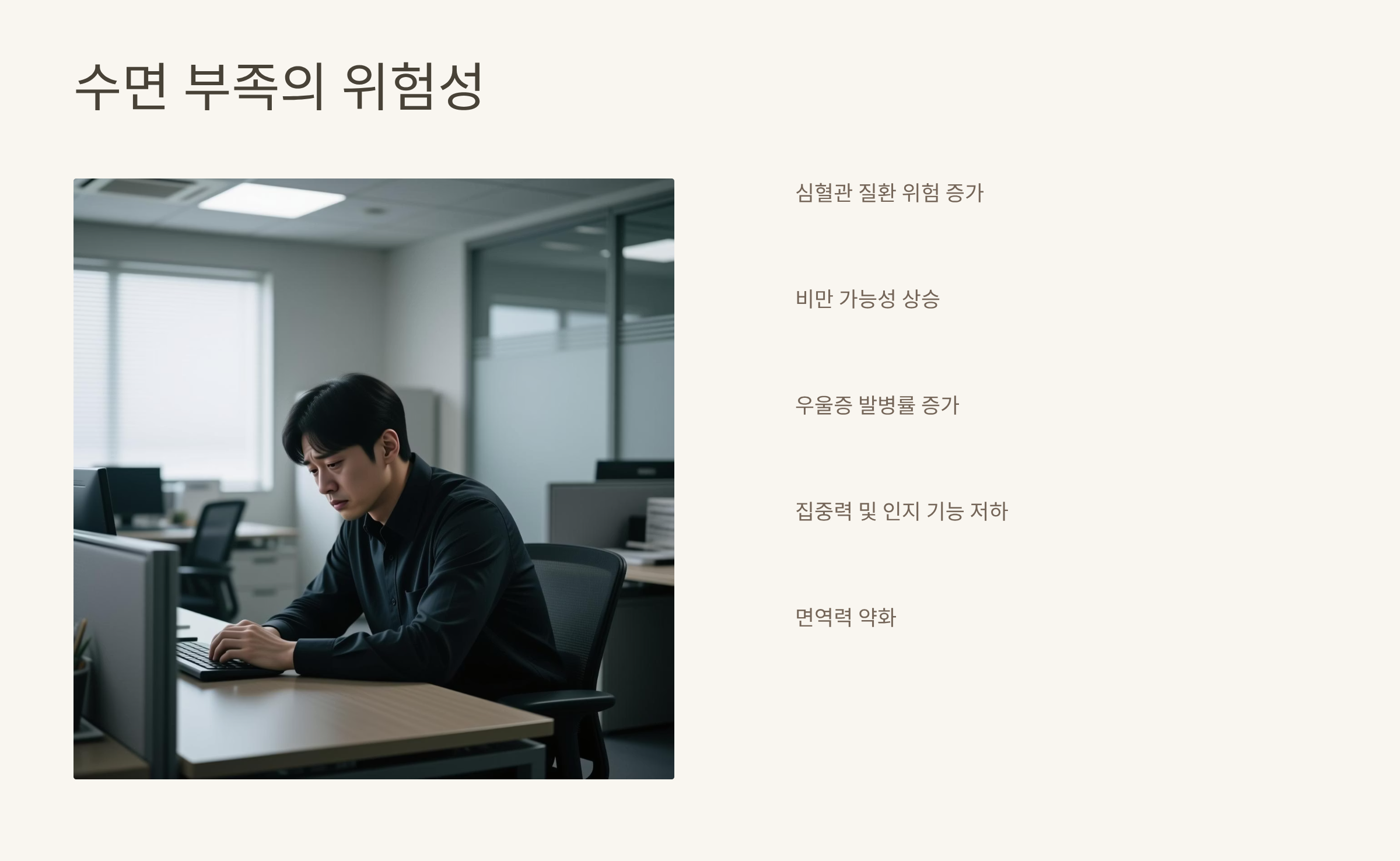 숙면은 단순한 ‘잠’이 아닙니다. 숙면은 면역력 강화, 뇌 기능 회복, 감정 조절, 체중 조절 등 다양한 건강 요소와 밀접하게 연결되어 있습니다. 연구에 따르면 7시간 미만의 수면은 심혈관 질환, 비만, 우울증 발병 위험을 높일 수 있습니다.