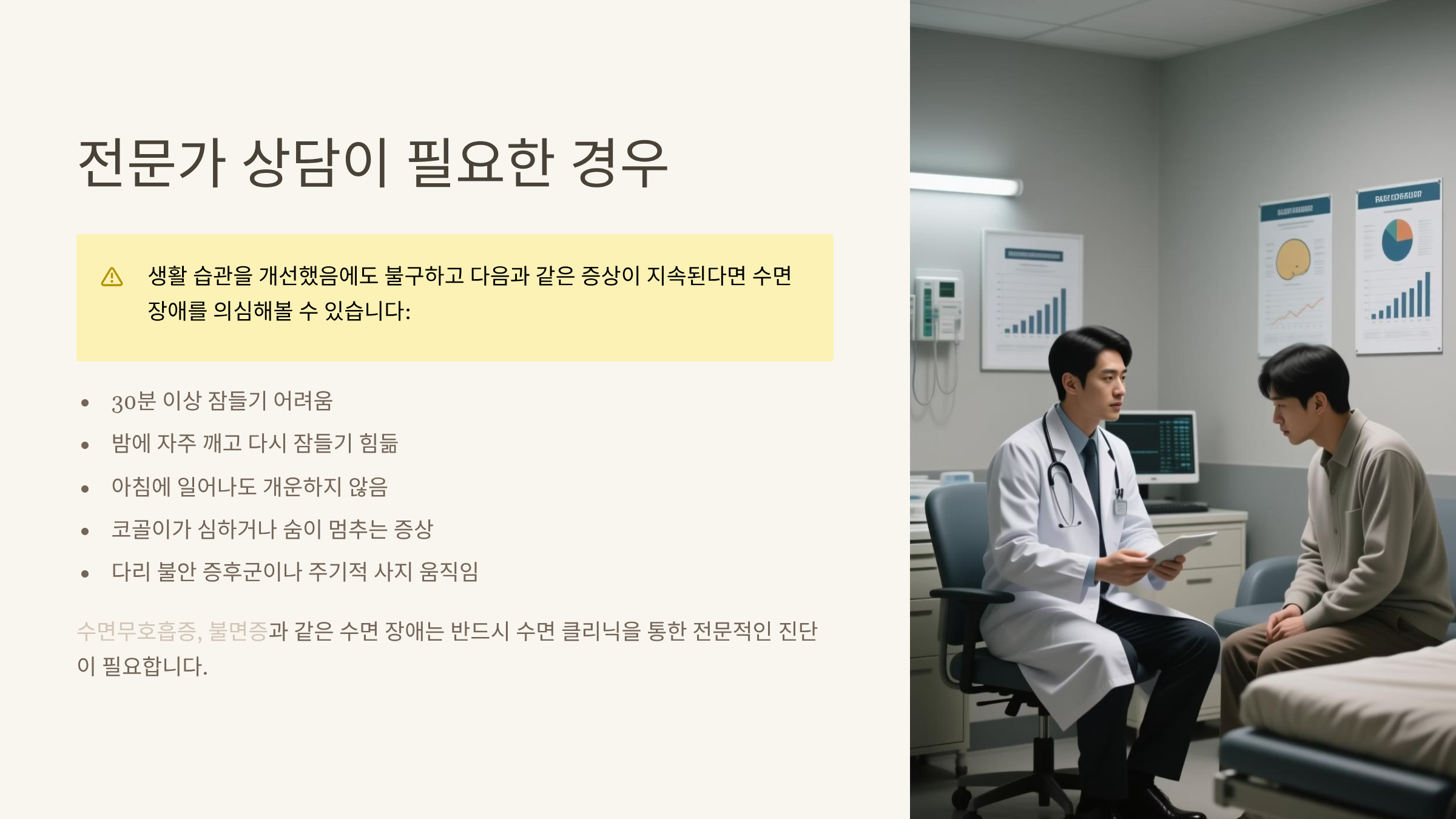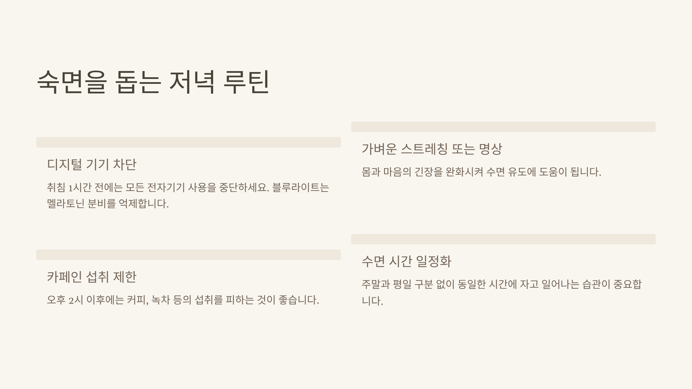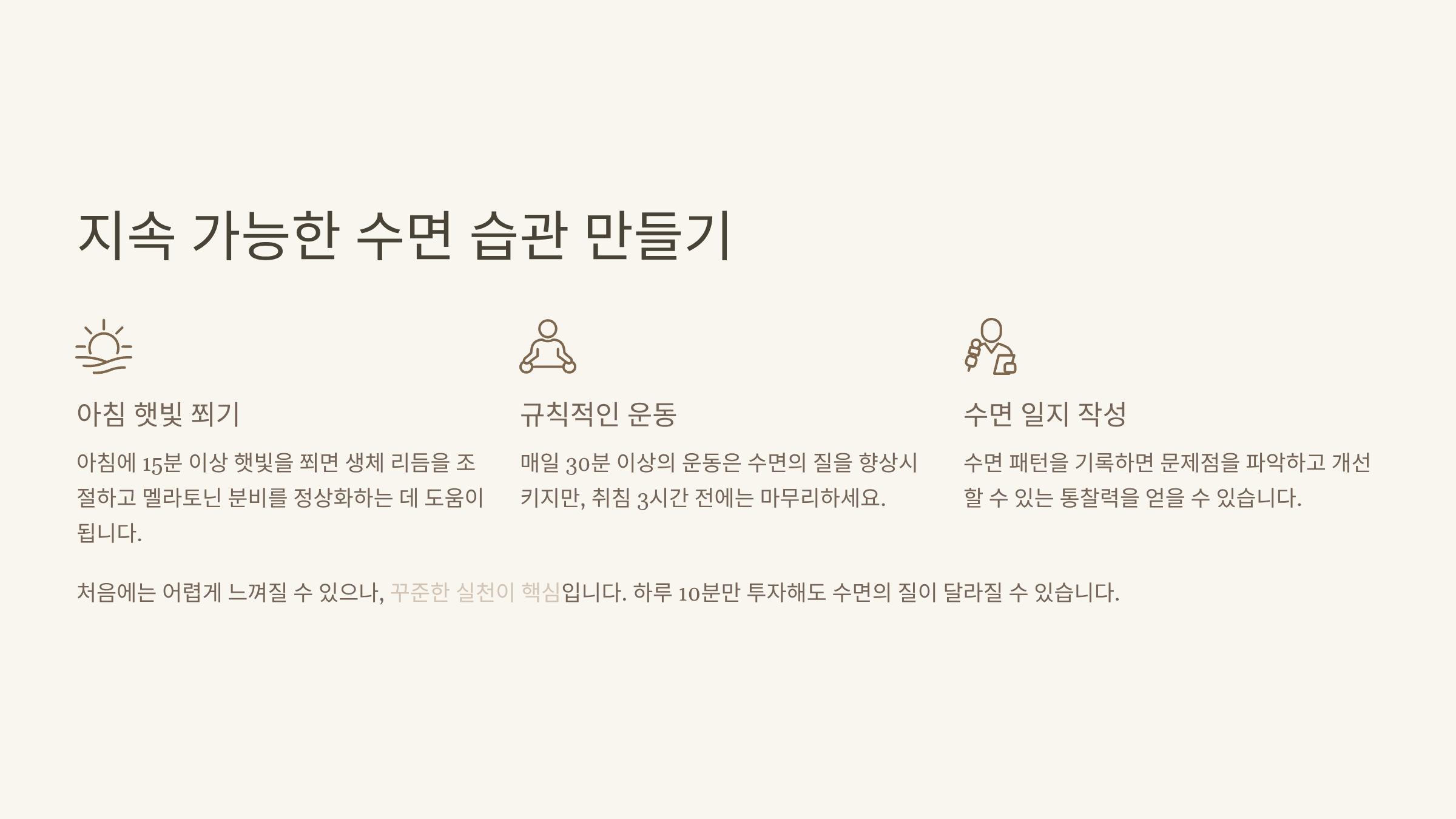 처음에는 어렵게 느껴질 수 있으나, 꾸준한 실천이 핵심입니다. 하루 10분만 투자해도 수면의 질이 달라질 수 있습니다. 특히 아침에 햇빛을 15분 이상 쬐는 습관은 생체 리듬을 조절하고 멜라토닌 분비를 정상화하는 데 큰 도움이 됩니다.