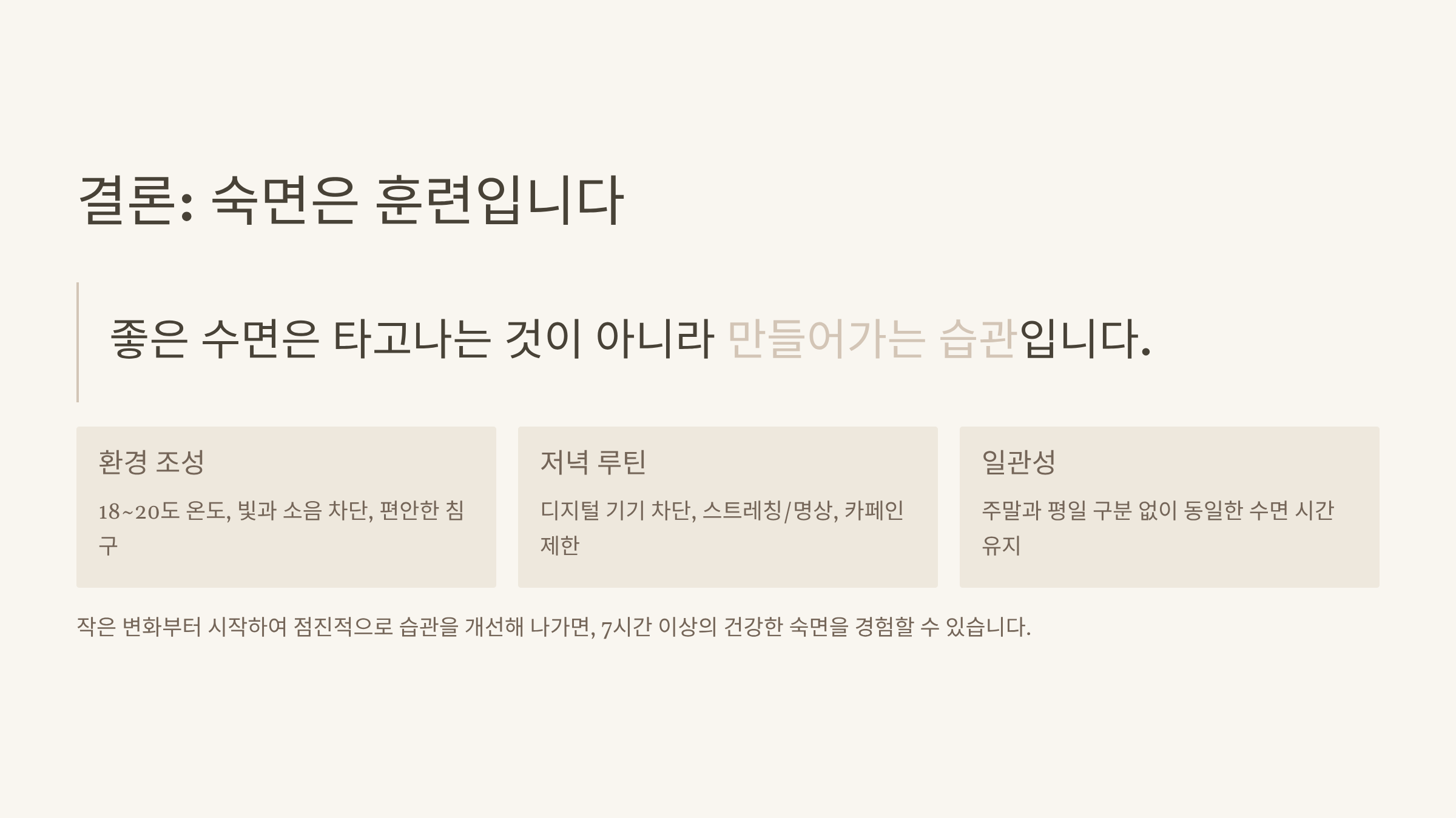 좋은 수면은 타고나는 것이 아니라 만들어가는 습관입니다. 위에서 소개한 방법들을 실천한다면 누구나 매일 7시간 숙면이 가능합니다. 수면은 당신의 생산성과 건강, 삶의 질을 바꾸는 가장 쉬운 투자입니다.