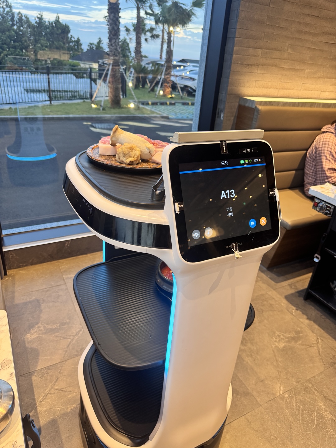 고기는 숙성 삼겹살과 숙성 목살을 주문했습니다. 흥미롭게도 서빙은 서빙 로봇이 담당하고 있었고, 정해진 테이블까지 정확히 고기를 배달해줍니다. 비주얼부터 퀄리티까지 완벽했고, 직원분이 직접 구워주는 서비스도 좋았습니다..