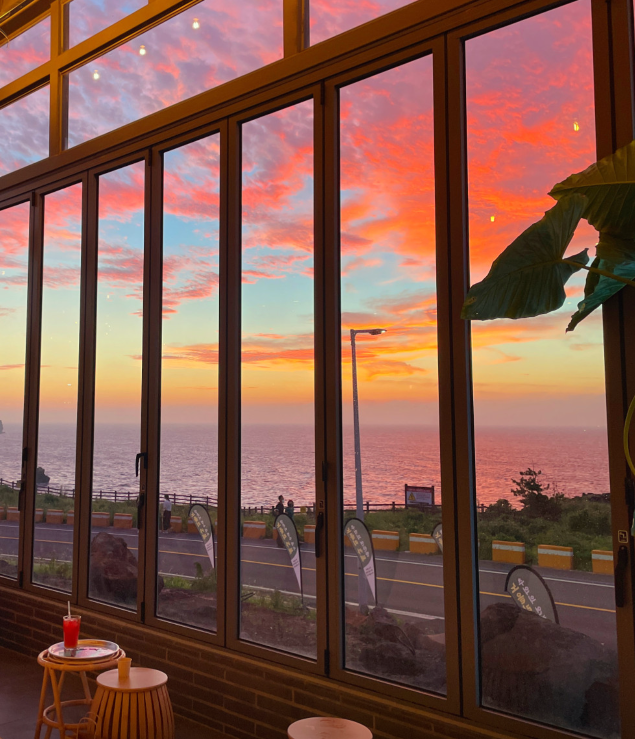 제주 오션뷰 카페 중 하나로, 일몰 시간에 붉게 물드는 내부 풍경이 압도적입니다. 탁 트인 유리창 너머 바다를 보며 마시는 시원한 커피는 여행의 피로를 싹 날려줍니다.