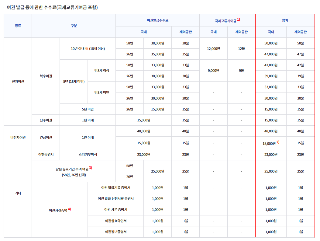- 10년 유효 전자여권: 아래표 참조 (전자여권 10년 50,000원)