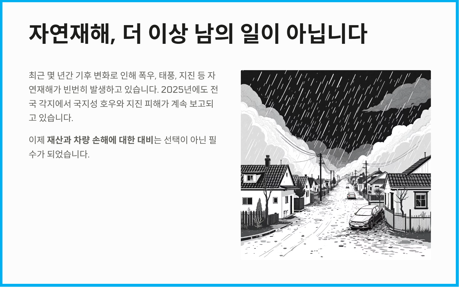 최근 몇 년간 기후 변화로 인한 폭우, 태풍, 지진 등 자연재해가 반복적으로 발생하고 있습니다. 2025년에도 전국 각지에서 국지성 호우와 지진 피해가 보고되면서 재산과 차량 보호에 대한 대비가 필수로 여겨지고 있습니다.