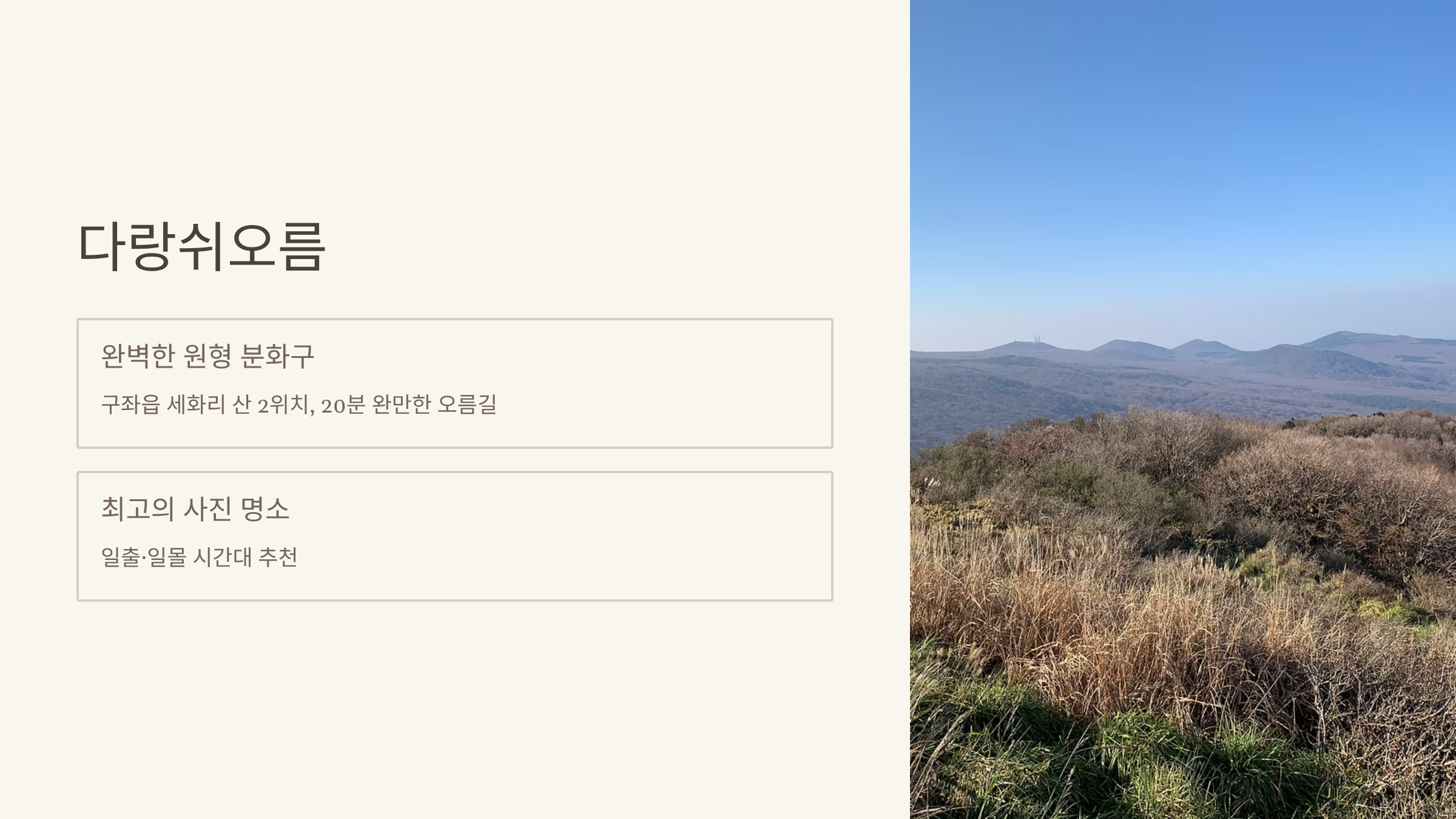 제주는 아름다운 자연경관과 함께 수많은 오름(작은 화산체)들이 여행객의 발걸음을 이끕니다.특히, 걷기 운동이나 힐링을 목적으로 하는 중장년층에게 오름은 매력적인 여행 코스입니다.이번