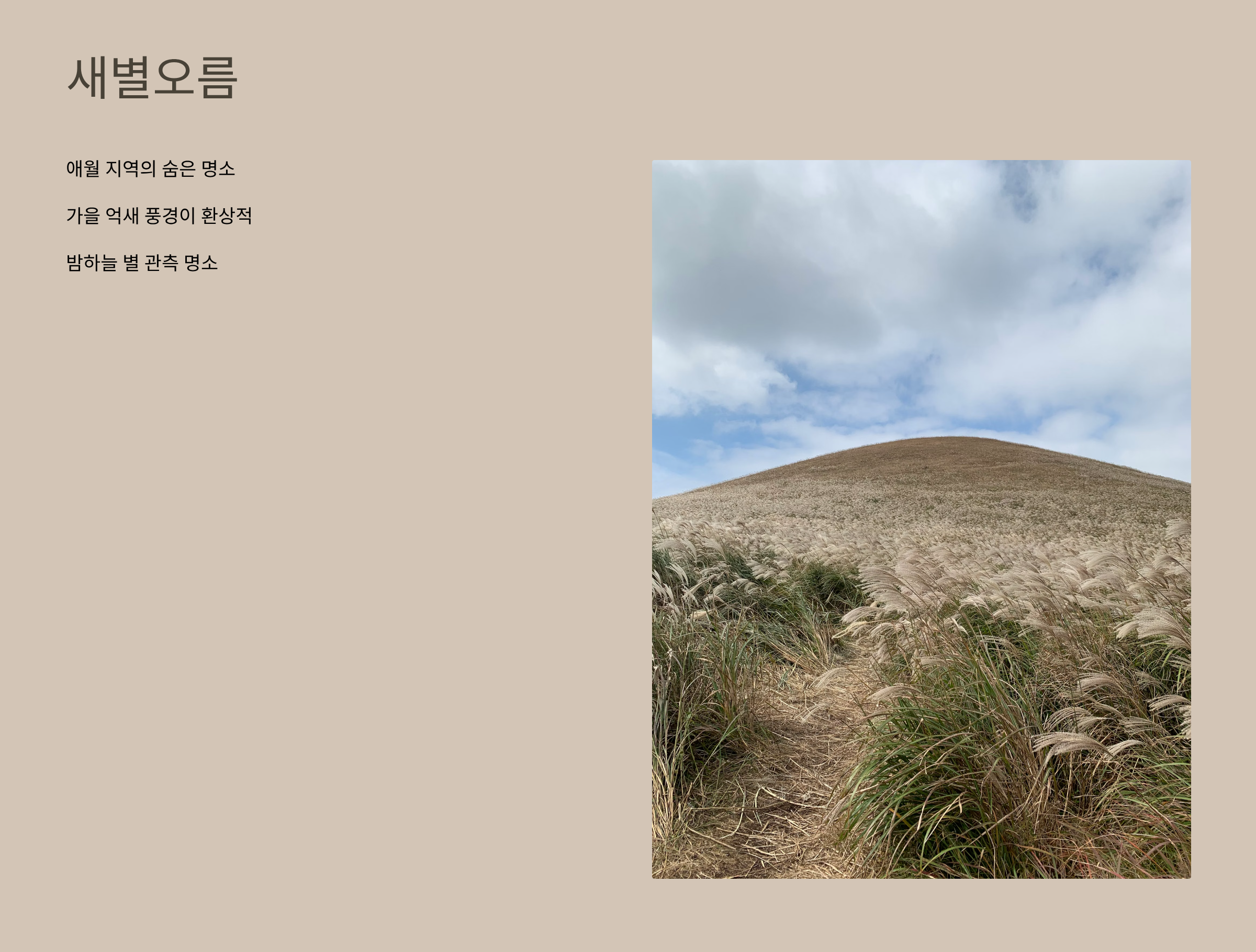 애월에 자리한 새별오름은 은은한 매력을 지닌 서부 지역의 숨은 명소입니다. 특히 가을이면 억새가 언덕을 가득 메우며 환상적인 풍경을 만들어냅니다. ‘새로운 별’이라는 뜻처럼, 밤이 되면 별이 쏟아지는 조용한 하늘을 즐기기에도 좋은 곳입니다.