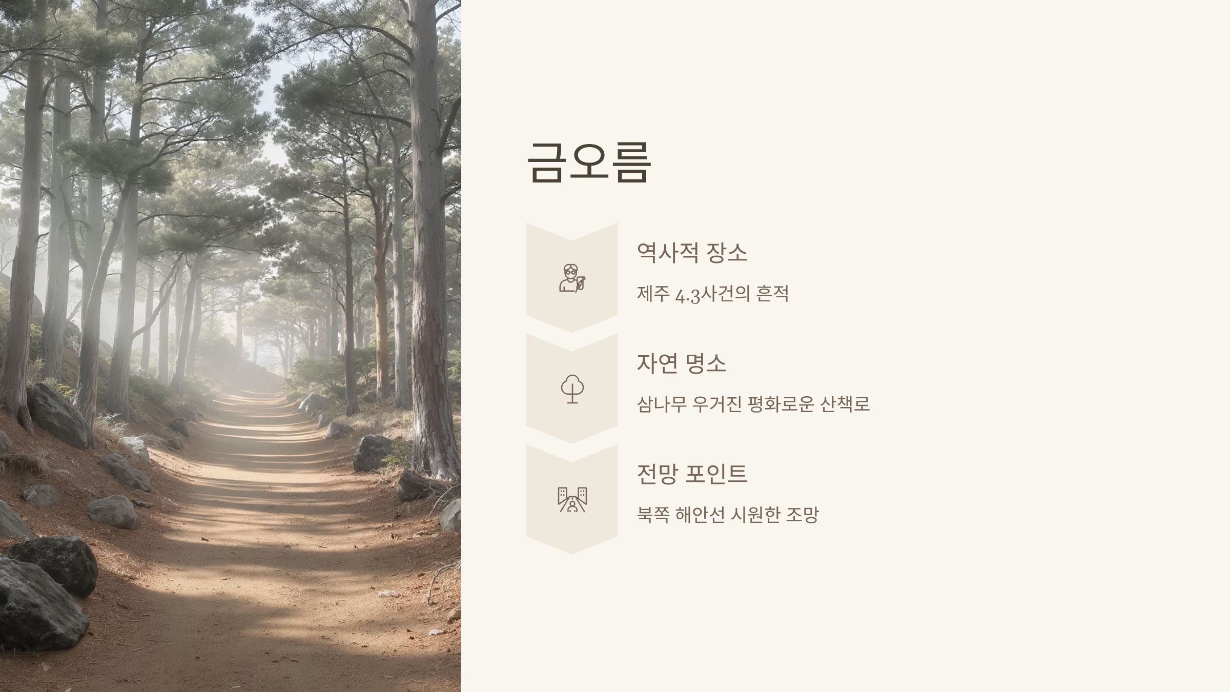 제주시 근처에 위치한 금오름은 단순한 자연 명소를 넘어, 1948년 제주 4.3사건의 흔적이 남아 있는 역사적인 장소입니다. 지금은 삼나무가 우거진 평화로운 산책로가 조성되어 있으며, 정상에서는 북쪽 해안선을 시원하게 조망할 수 있습니다.