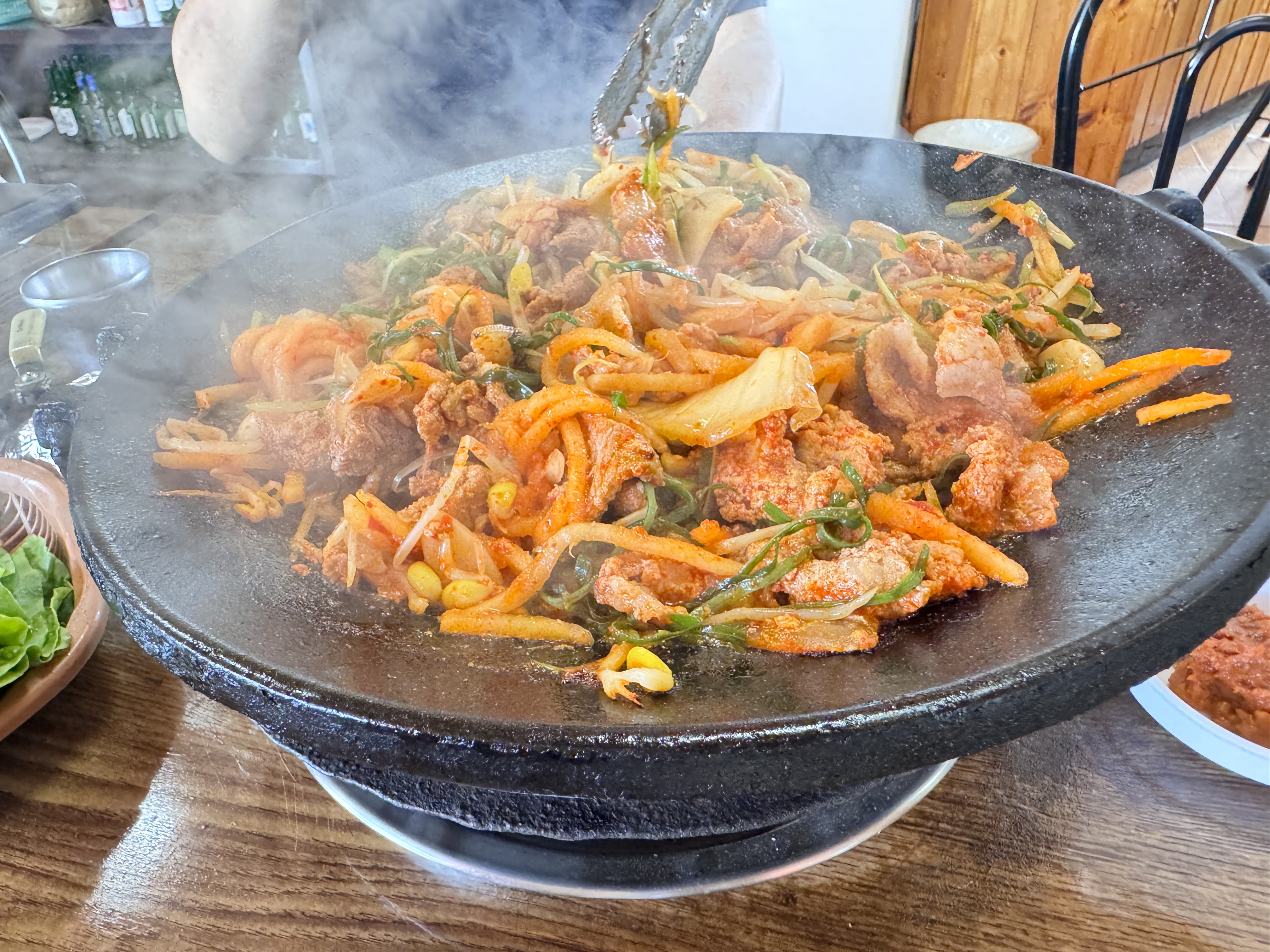 그위에 고기먼저 익히고 야채와 마늘을 듬뿍 올리면 감칠맛 가득한 비주얼과 향이 일품입니다.