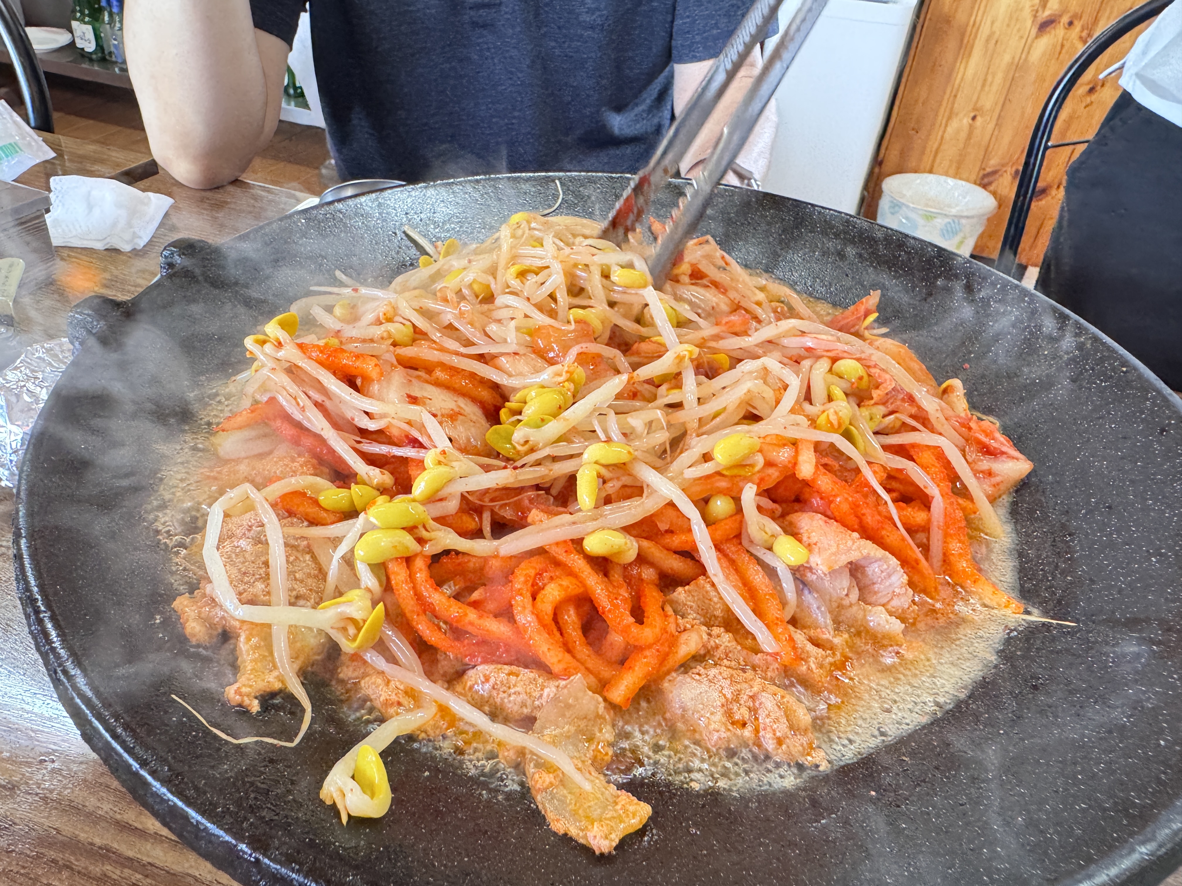 매콤달달한 양념에 잘 버무려진 돼지고기와 콩나물, 무생채가 조화를 이루며 밥이 절로 들어가는 맛!