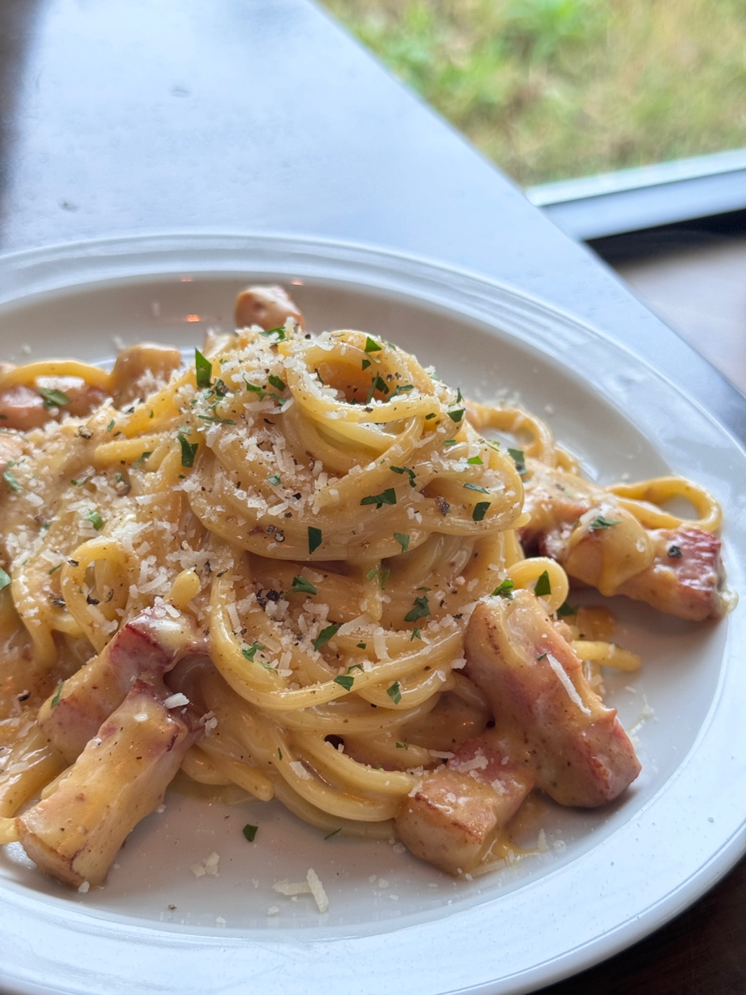 부드러운 크림과 풍미를 자랑하는 까르보나라는 제주 아카이브의 인기 메뉴 중 하나입니다.