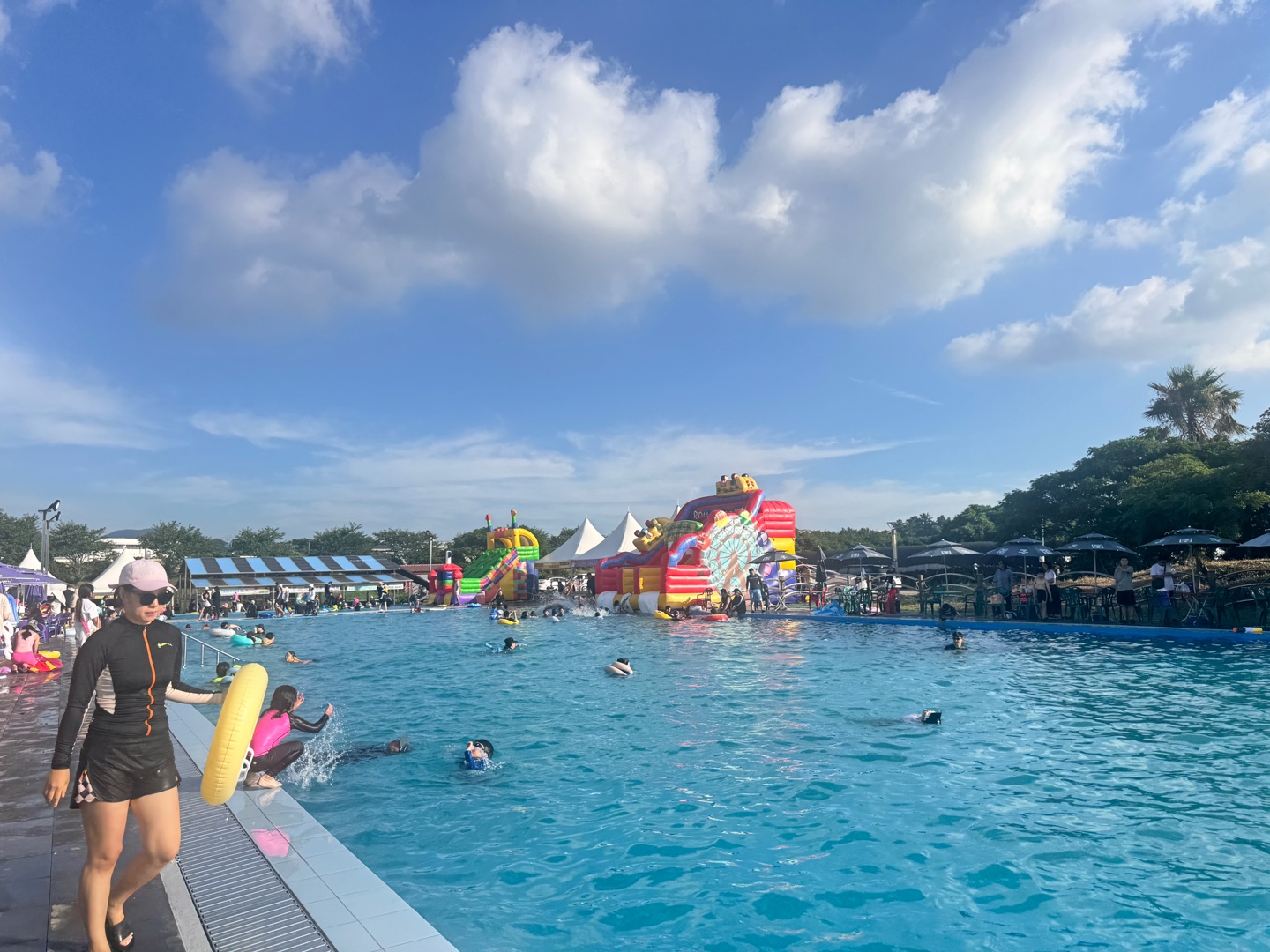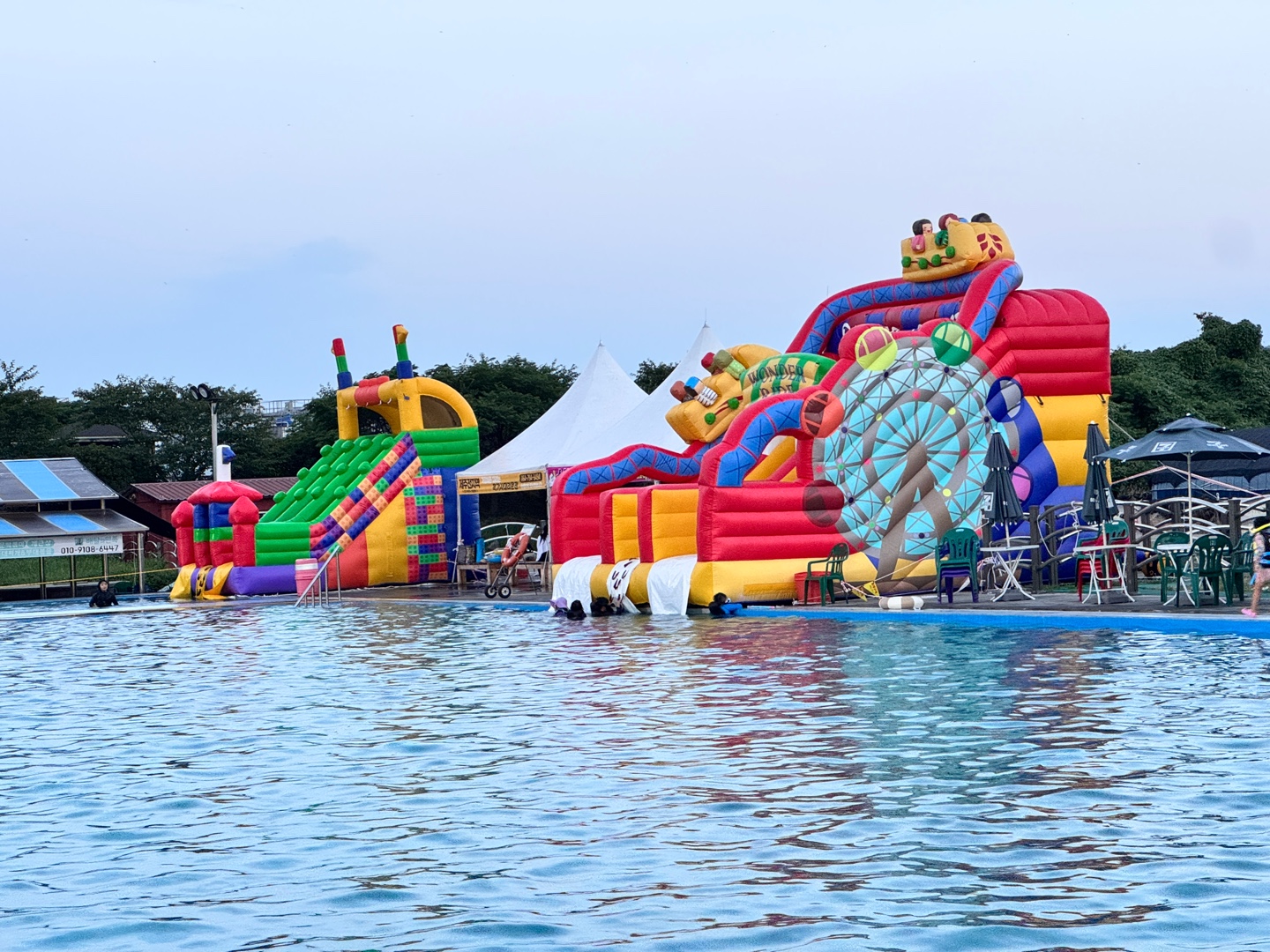 얕은 유아풀장과 에어바운스 미끄럼틀도 마련돼 있어 아이들이 즐겁게 놀 수 있어요.
