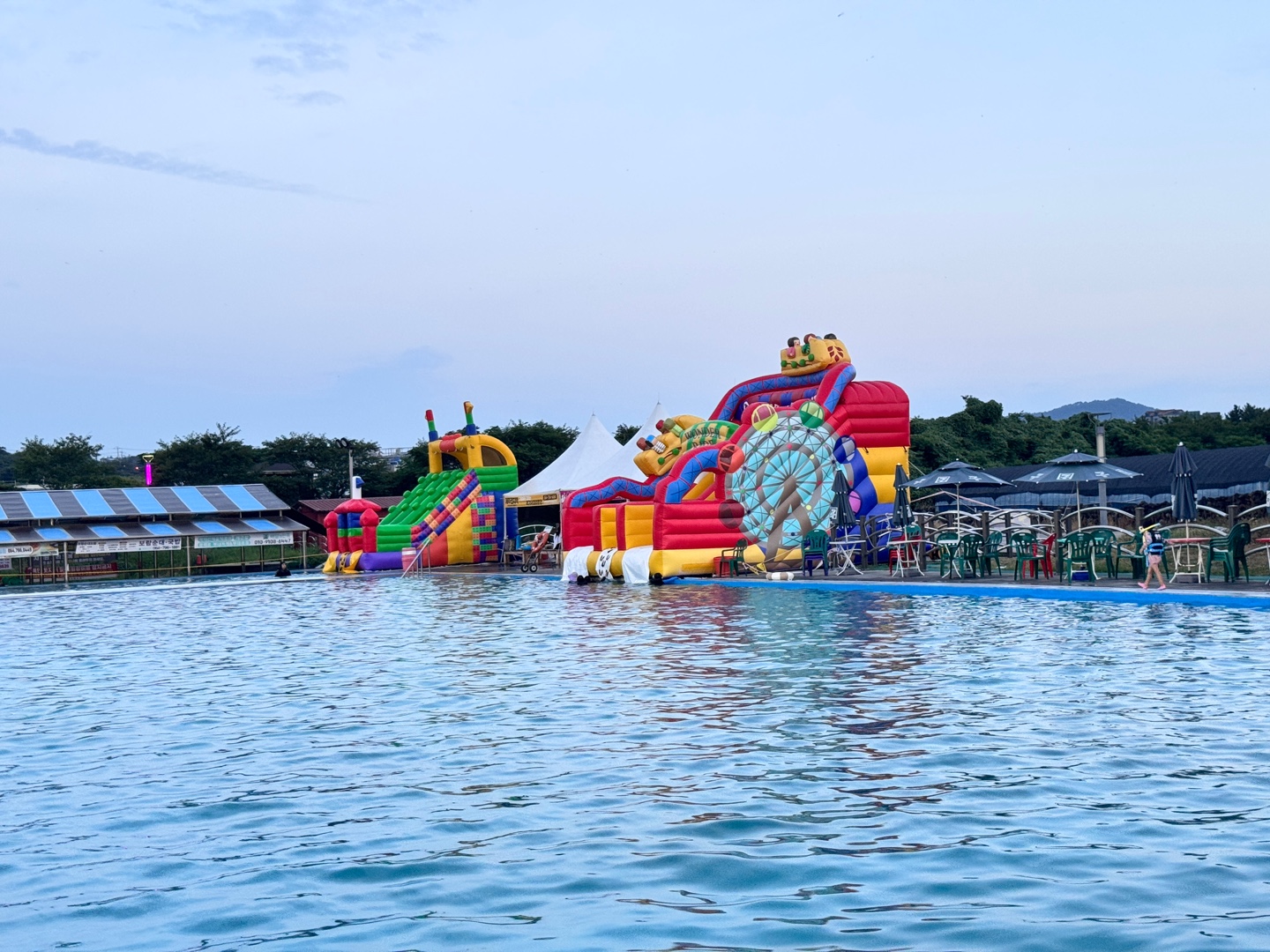 얕은 유아풀장과 에어바운스 미끄럼틀도 마련돼 있어 아이들이 즐겁게 놀 수 있어요.