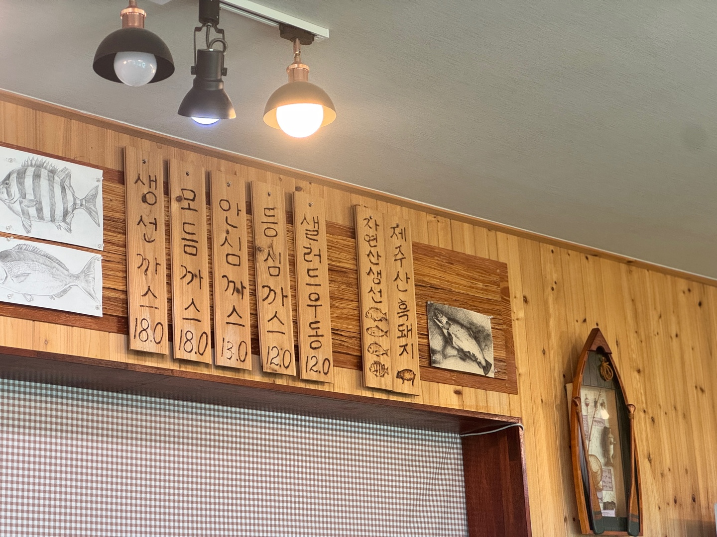 입구에는 오늘의 생선이 표시돼 있고, 키오스크에서 테이블 지정 후 주문 결제를 하는 시스템이에요.