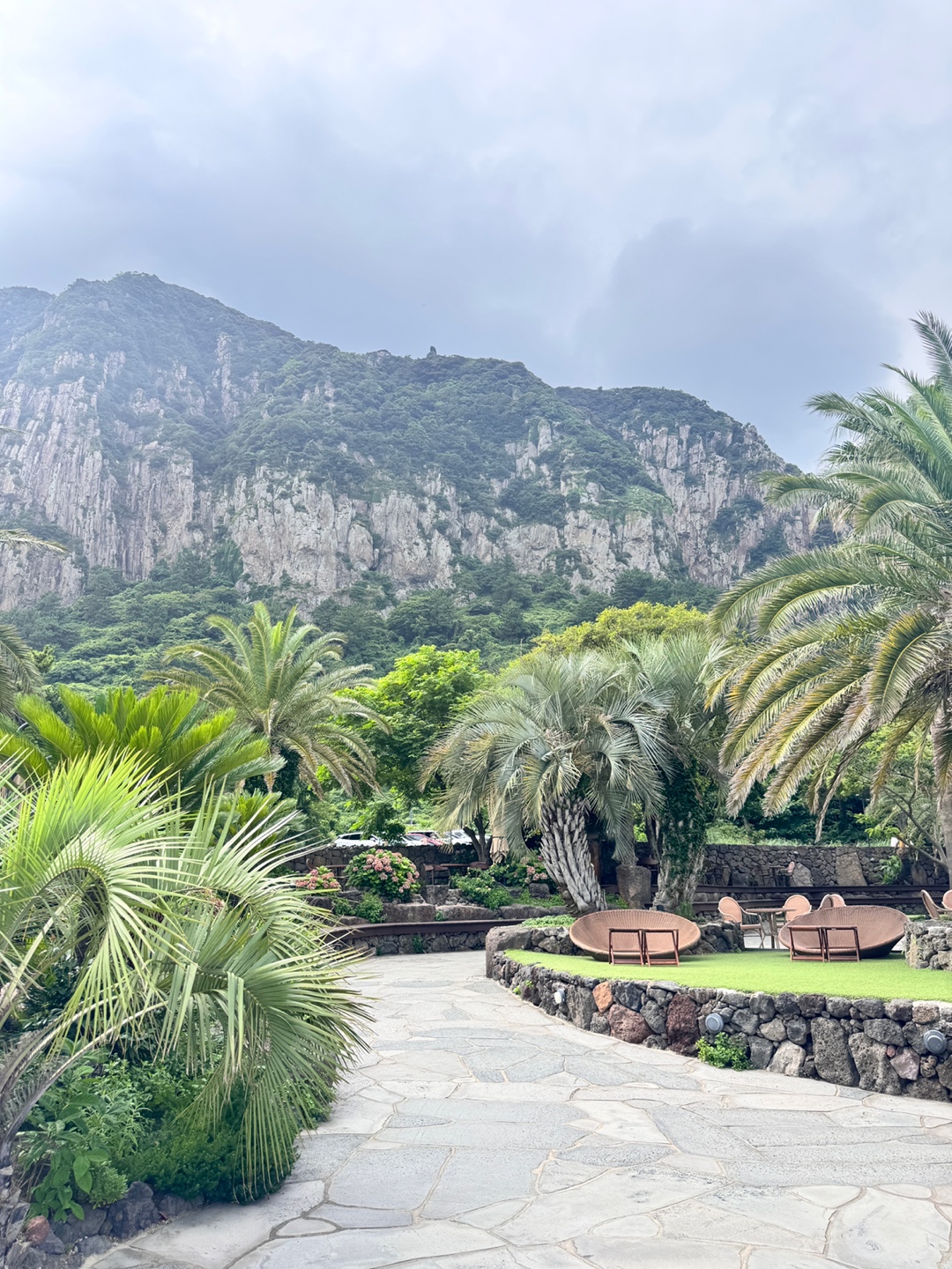 ‘원앤온리 제주’는 정면에는 에메랄드빛 바다, 후면에는 웅장한 산방산이 펼쳐져 있어 어디서든 아름다운 제주의 자연을 감상할 수 있어요. 넉넉한 주차 공간과 야자수가 줄지어 있는 입구는 마치 동남아 리조트를 연상케 합니다.
