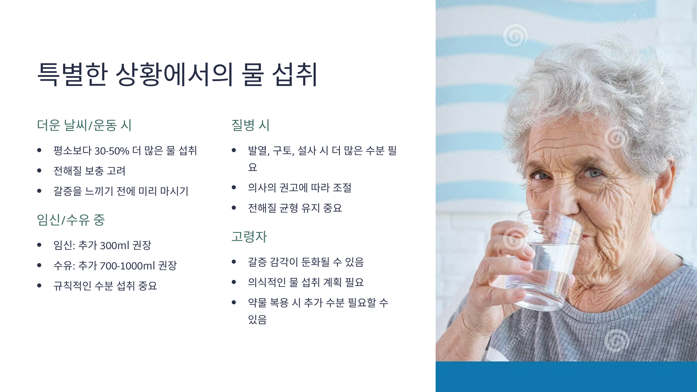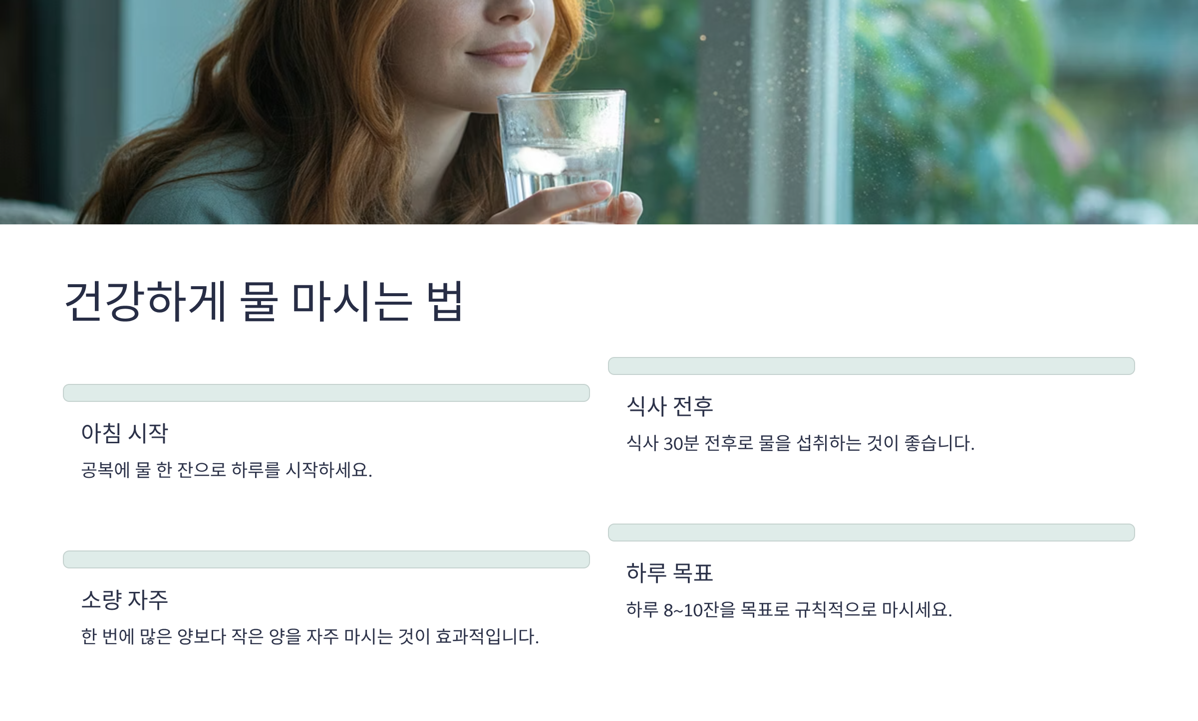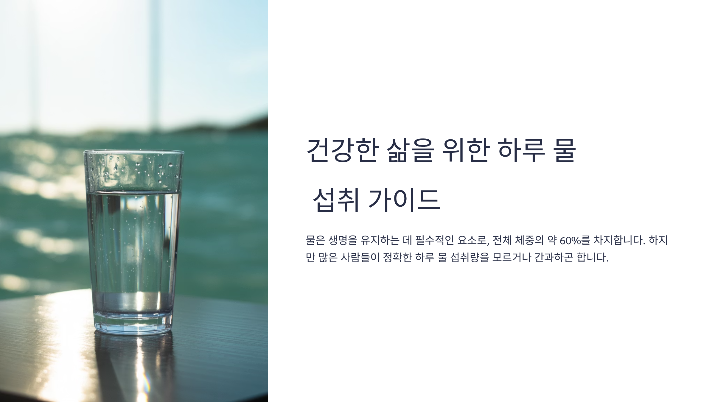 물 마시는 것은 선택이 아니라 필수입니다. 하루 물 섭취량을 꾸준히 관리하면 신체 건강뿐 아니라 정신적 활력도 유지할 수 있습니다. 지금 이 순간, 물 한 잔으로 건강한 하루를 시작해보세요.