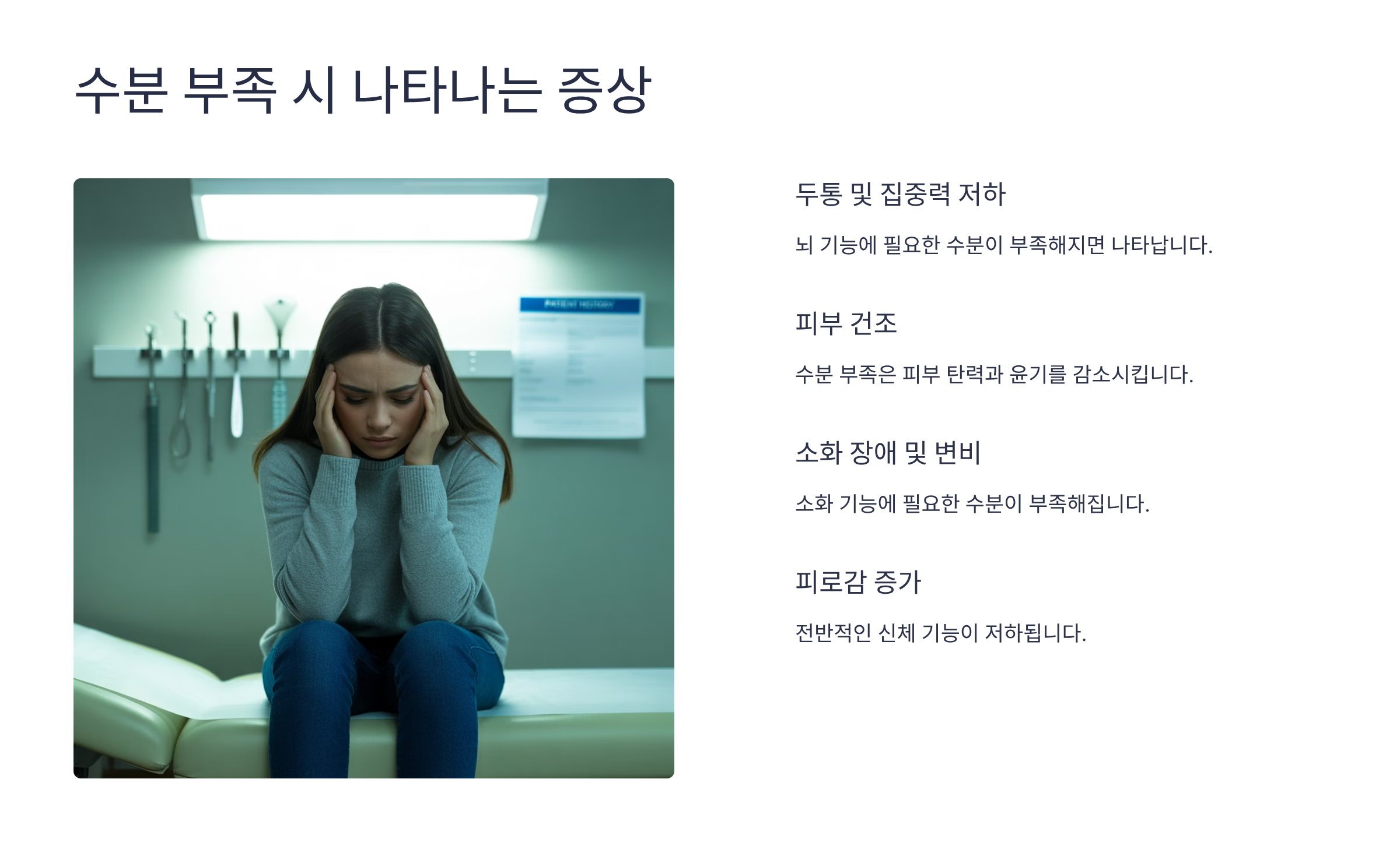 충분한 수분을 섭취하지 않으면 다음과 같은 증상이 나타날 수 있습니다.