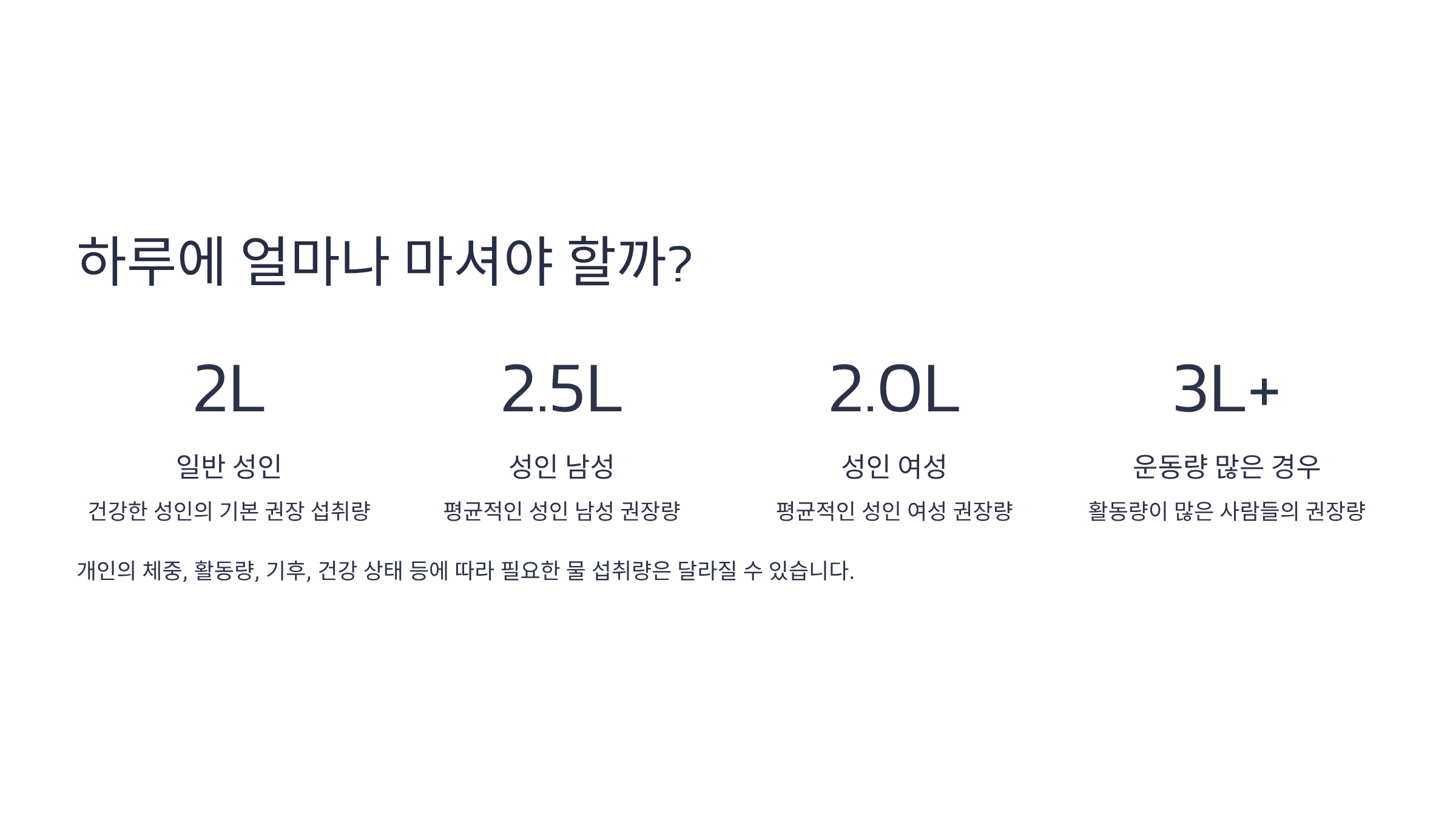 일반적으로 건강한 성인은 하루 1.5L에서 2L의 물을 섭취하는 것이 권장됩니다. 하지만 이는 개인의 체중, 활동량, 기후, 건강 상태 등에 따라 달라질 수 있습니다.