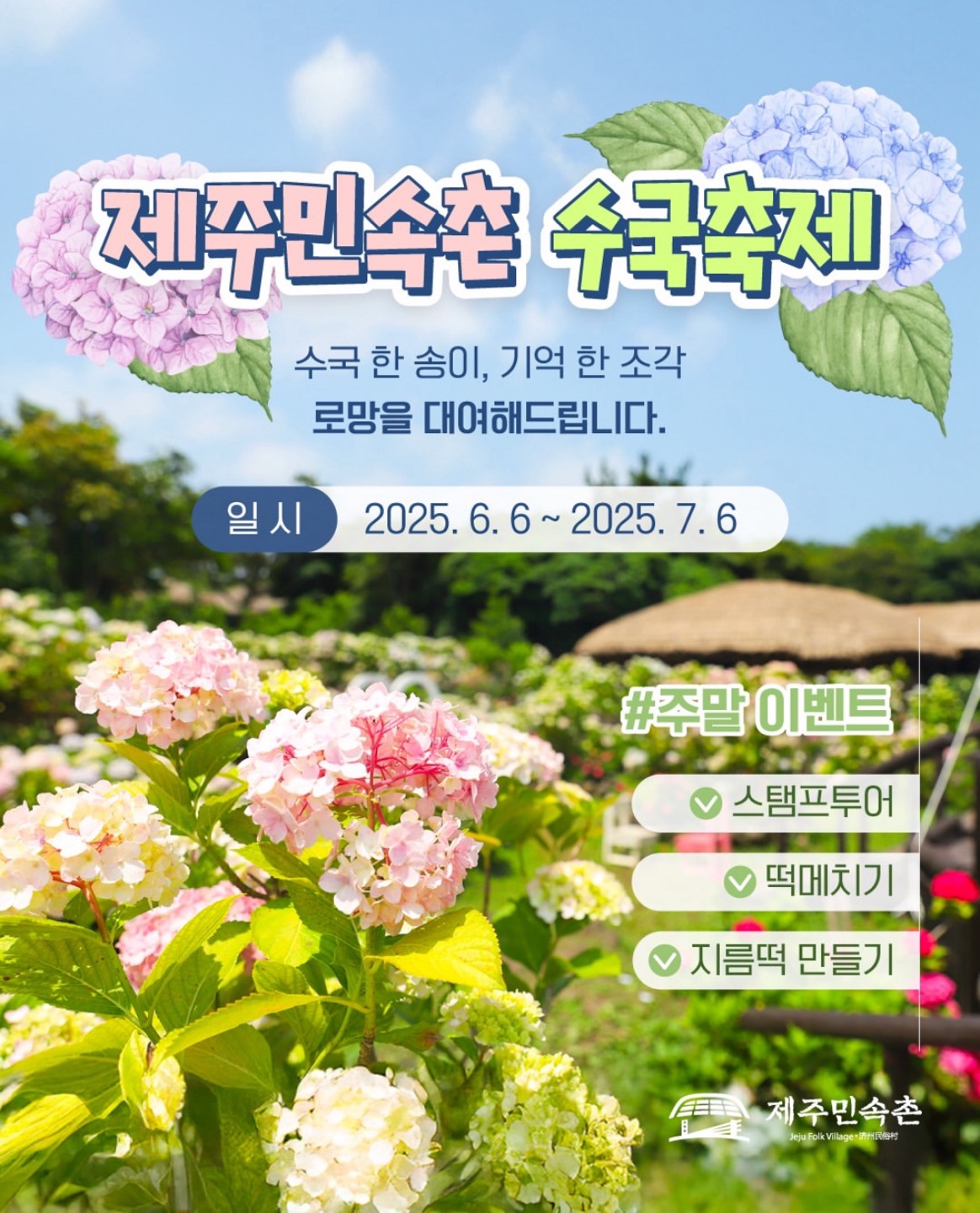 2025년 여름, 제주의 전통과 자연이 어우러진 제주민속촌 수국축제가 돌아왔습니다. 수국의 절정과 함께 다양한 체험, 사진 명소, 한복 할인까지! 이번 여름엔 제주민속촌으로 떠나보세요.